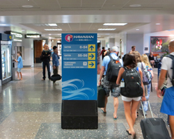 Just like at every other major airport, your arrival at HNL will probably begin with a bit of a walk from the gate to baggage claim. Personally, I’m ready to stretch my legs and breathe some fresh air by that point. But if you have difficulty walking and/or if you just can’t wait to get back into another crowded transport tube, there’s a free Wiki-Wiki shuttle bus that constantly runs from each terminal back to the main terminal (third level, above security and baggage claim). Just get to the sidewalk outside your gate and look for the nearest Wiki-Wiki Bus Stop sign. The shuttle will be around shortly to give you a lift (6am to 10pm). Click here to see a map of the Wiki-Wiki Bus route at the Honolulu Airport (opens a new window/tab).
