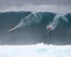 If you go to Waimea Bay when the winter surf is getting big (approximately October to March), you’re in for a much different extreme adventure! Just compare the pictures at left and above. It’s not uncommon to have waves crashing across the top of the jumping rock and/or a five-meter shore break (measuring by wave face) crashing into the sand across the entire width of the bay! Trust me when I say that winter at Waimea Bay is for experts only!
